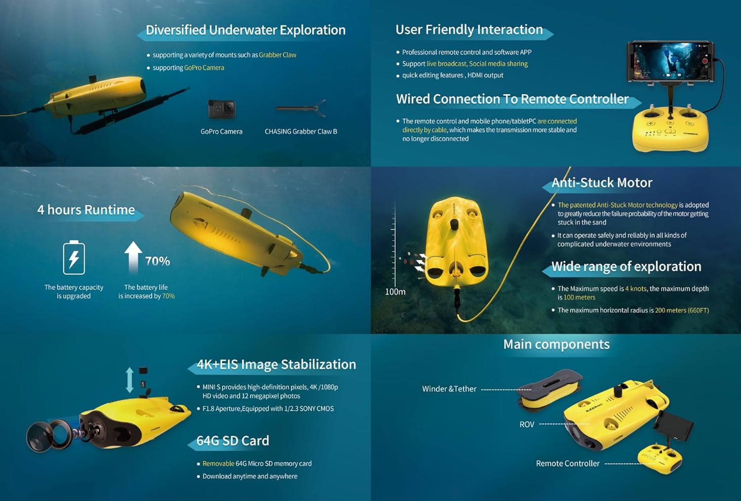 El Chasing Innovation Gladius Mini es un dron submarino potente y bien diseñado que ofrece una experiencia inmersiva y de alta calidad para la exploración y fotografía submarina. Con una construcción robusta, una cámara 4K y un rendimiento confiable, es una excelente opción tanto para aficionados como para profesionales que desean adentrarse en el mundo submarino.